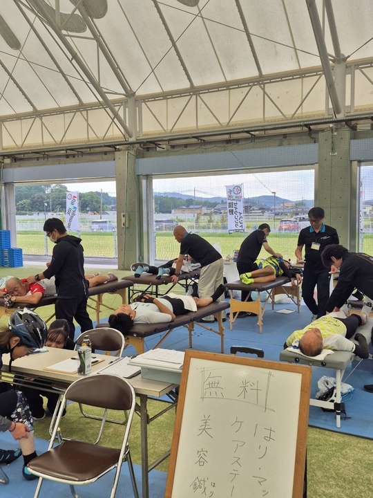 2025年9月28日に開催された自転車イベント「ファンライド鏡野」にて、岡山県鍼灸師会はケアステーションを設置し、参加されたサイクリストの皆さまの身体ケアを行いました。